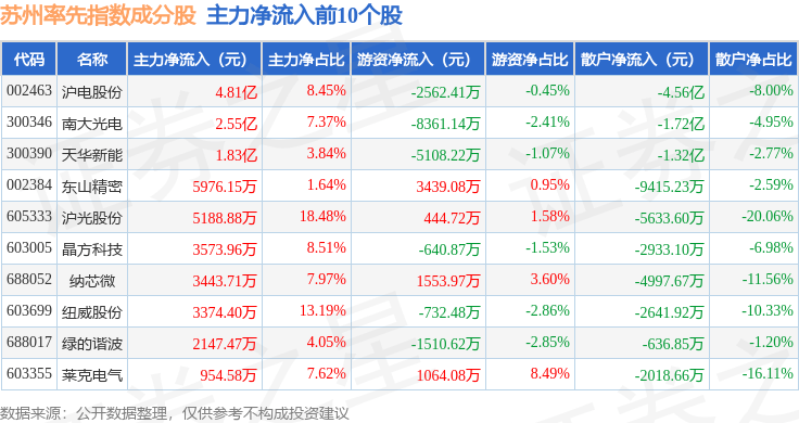 资金流向方面,苏州率先(399410)指数成份股当日主力资金净流入合计4.46亿元,游资资金净流入合计7039.0万元,散户资金净流出合计5.16亿元。成份股资金流向详情见下表: