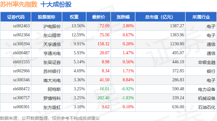 苏州率先(399410)指数十大成份股详情如下: