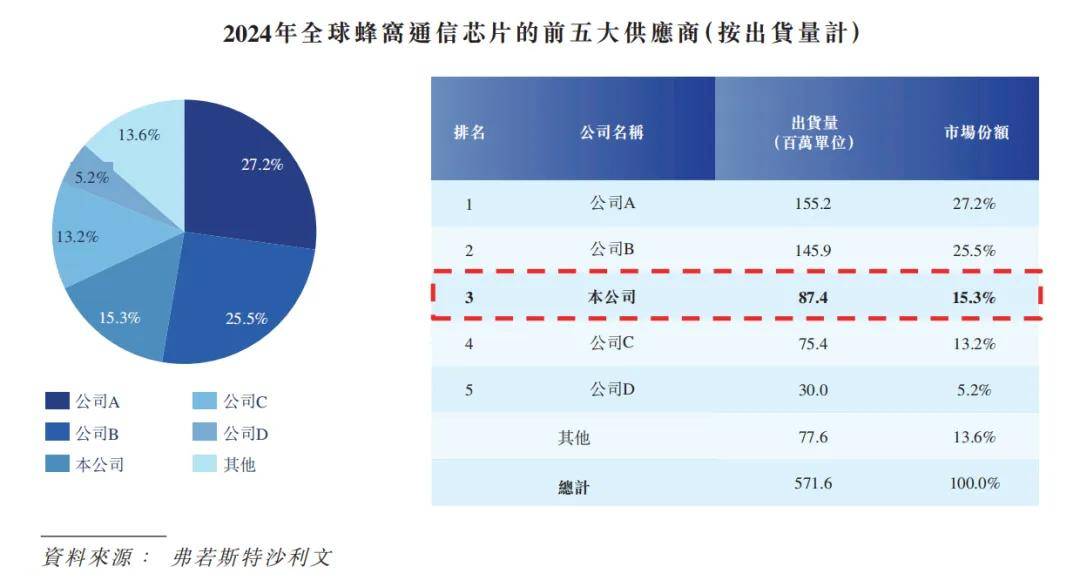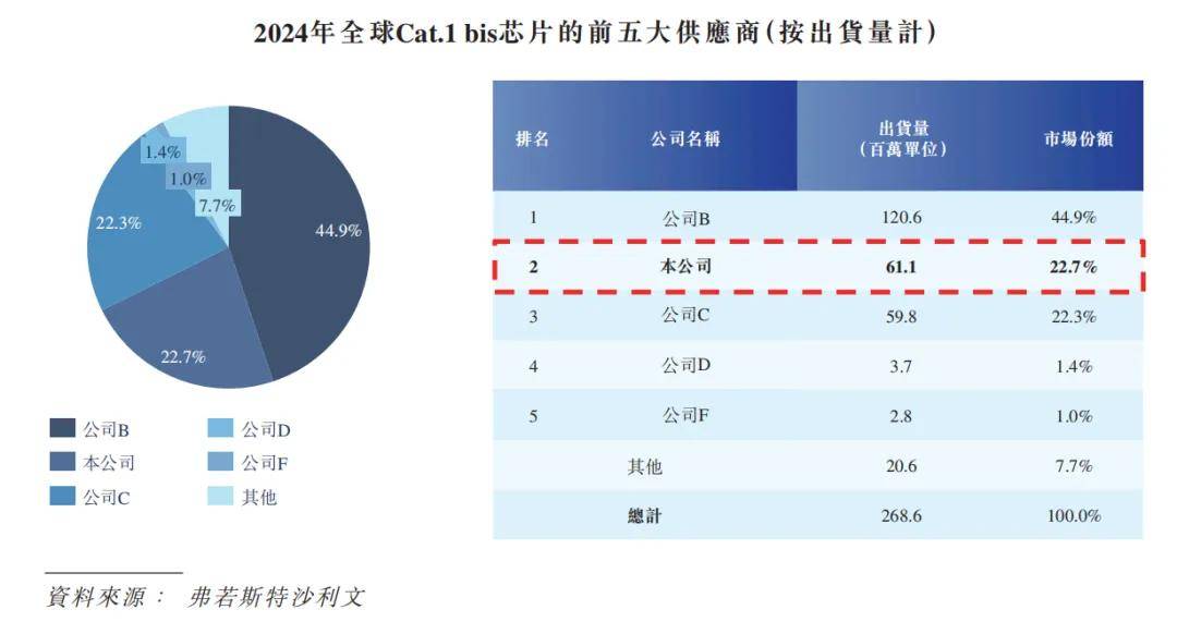 从招股书附注信息来看,全球蜂窝通信芯片五大供应商分别为高通(公司A)、翱捷通信(公司B)、移芯通信、紫光展锐(公司C)和芯翼信息科技(公司D)。