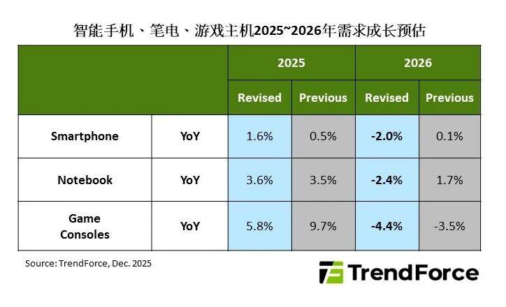 根据TrendForce集邦咨询最新发布报告显示,受到存储器价格飙涨影响,消费性电子产品整机成本大幅拉升,并迫使终端产品定价上调,进而冲击消费市场。TrendForce集邦咨询继11月上旬下修2026年全球智能手机及笔电的生产出货预测后,此次也下修游戏主机2026年出货预测,从原先预估的年减3.5%调降至年减4.4%。