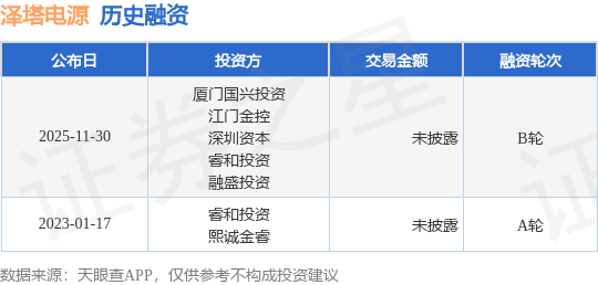 证券之星消息,根据天眼查APP于11月30日公布的信息整理,深圳市泽塔电源系统有限公司B轮融资,融资额未披露,参与投资的机构包括厦门国兴投资,江门金控,深圳资本,睿和投资,融盛投资。