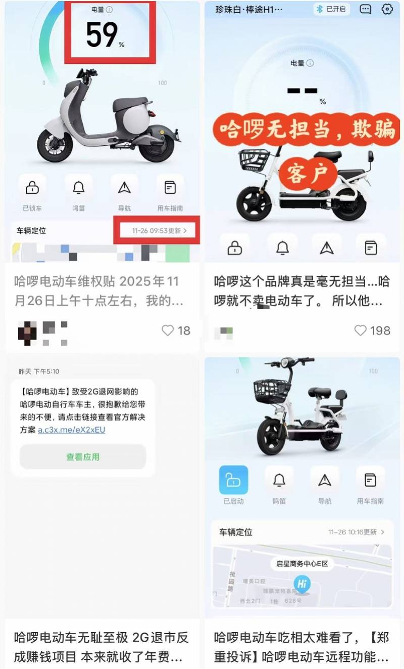 据了解,有网友发文称,“我的车辆从11月26日开始,远程控车、电量查询、实时定位等核心智能功能全部失效。”还有网友表示,“哈啰电动车无法开锁,冬天晚上把我扔在路边。晚上骑出去的时候还疑问为什么电量一直停在上次的74%不动,然后回来的时候无法开锁!”