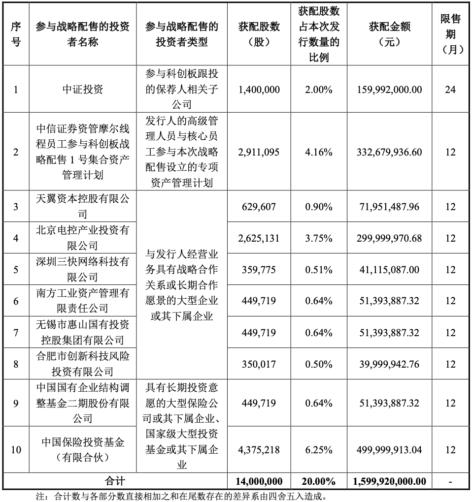 本次发行中,初始战略配售发行数量为1400万股,占本次发行数量20.00%。最终战略配售数量为1400万股,占本次发行数量20.00%。中国电信通过旗下天翼资本控股有限公司、美团通过其旗下深圳三快网络科技有限公司分别战略配售了摩尔线程63万股(7195万元)、36万股(4112万元)。