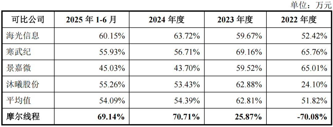 2022年、2023年、2024年、2025年1-6月,摩尔线程的综合毛利率分别为-70.08%、25.87%、70.71%、69.14%,与海光信息、寒武纪、景嘉微、沐曦股份对比情况如下: