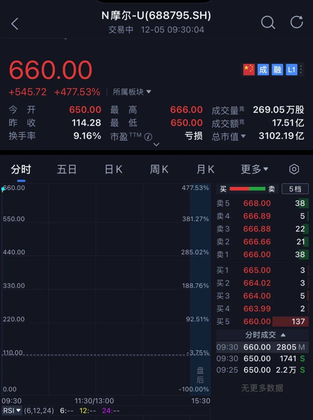 摩尔线程拟发行新股7000万股,占发行后总股本的14.89%,每股发行价格为114.28元。其开盘价为650.00元/股,大涨468.78%,总市值为3055亿元,跻身科创板市值TOP3,仅次于寒武纪(5648亿元)、海光信息(4951亿元)。