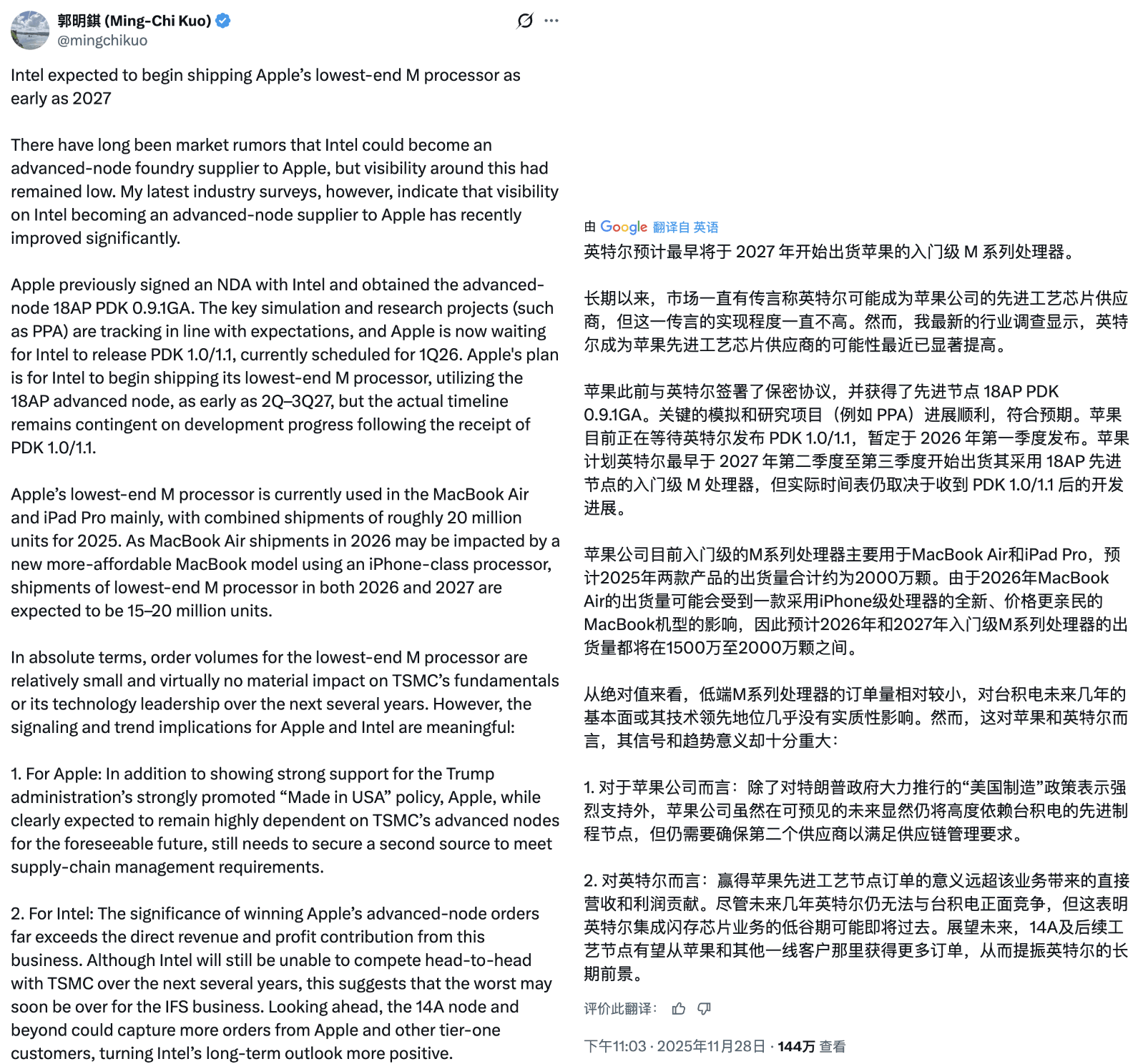 早在上个月,知名供应链分析师郭明錤就曾透露,苹果计划最快在 2027 年,让英特尔开始代工部分入门级 M 系列芯片,主要面向部分 Mac 和 iPad 型号,采用英特尔的 18A 制程。