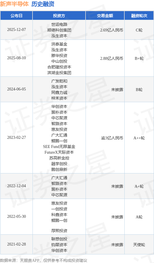 证券之星消息,根据天眼查APP于12月7日公布的信息整理,深圳新声半导体有限公司C轮融资,融资额2.69亿人民币,参与投资的机构包括世运电路,顺德科创集团,泓生资本。