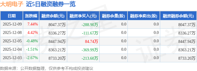 证券之星消息,截至2025年12月9日收盘,大明电子(603376)报收于42.15元,上涨7.44%,换手率40.7%,成交量12.63万手,成交额5.25亿元。