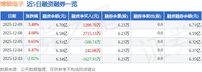 博敏电子融资融券信息显示,融资方面,当日融资买入5419.96万元,融资偿还4219.25万元,融资净买入1200.7万元。融券方面,融券卖出0.0股,融券偿还0.0股,融券余量6.23万股,融券余额72.33万元。融资融券余额6.71亿元。