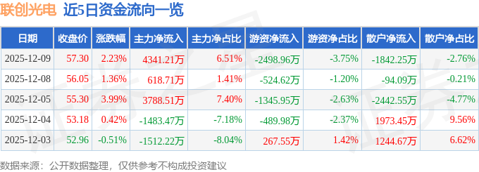 证券之星消息,截至2025年12月9日收盘,联创光电(600363)报收于57.3元,上涨2.23%,换手率2.56%,成交量11.55万手,成交额6.67亿元。