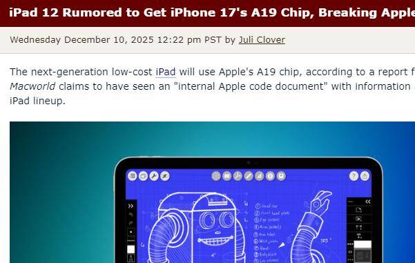 【环球网科技综合报道】12月11日消息,据MacRumors报道,2026年推出的12代入门级iPad或搭载iPhone 17同款A19芯片,这一配置将打破苹果延续多年的产品策略。该报道称其获取的苹果内部代码文档显示了这一突破性信息。