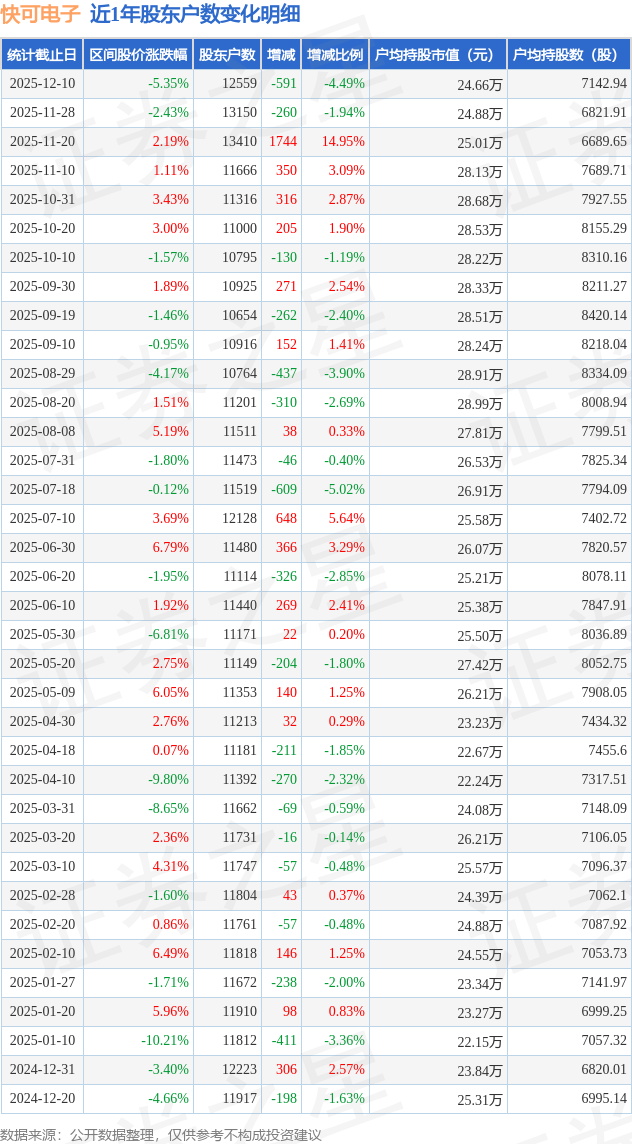 从股价来看,2025年11月28日至2025年12月10日,快可电子区间跌幅为5.35%,在此期间股东户数减少591.0户,减幅为4.49%。