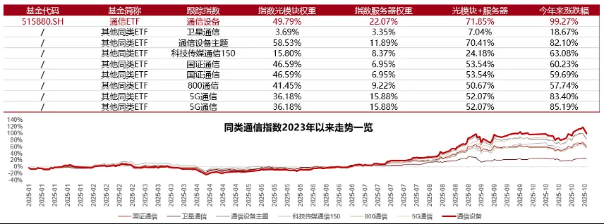 它其实有点被名字耽误了,大家看到通信ETF都以为是运营商。实际上我们这个是通信设备指数里面没有运营商,主要就是光模块、服务器、光纤、铜连接。
