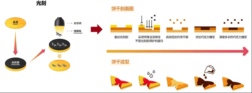 半导体芯片是什么,这个咱们就跳过了。这里有一些具体的工艺,比如光刻机、光刻胶,还有掩膜板。把光刻胶放上去,然后用溶液把光刻胶没有覆盖的地方移除掉,再把这些地方挖出槽来。之后,就会在上面再放上我们想要放上去的工艺,沉积完了之后就清洗。其实这个图就是芯片生产工艺的一个模拟。