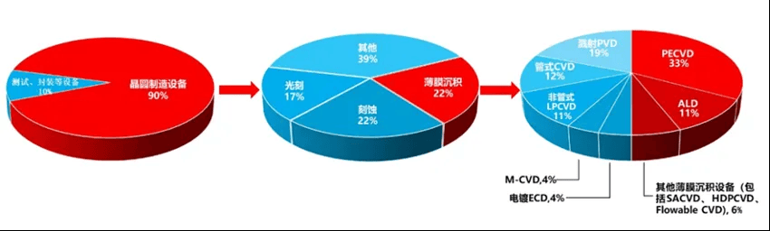 薄膜沉积有三类:PVD、CVD和ALD。具体是干什么的,我们也不展开说了,我也没有那么专业能给大家就把每一个环节具体干什么都讲清楚。我们就稍微把它抽离一点,然后从一个中观的角度去看它到底是在里边起到什么样的作用、占据怎么样的份额。下面这张图大家会看到,这三个最重要的设备薄膜沉积22%,刻蚀占比22%,光刻占比17%。不管是全球还是中国,其实这个都还是有一个非常高的增速,这是我们想给大家说的。