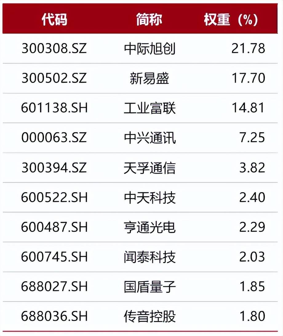 刚才讲了半天的通信ETF(515880)。大家可以看一下它的前十大权重,如下图。