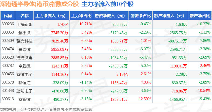 资金流向方面,深港通半导体(港币)(983068)指数成份股当日主力资金净流出合计12.02亿元,游资资金净流入合计5.18亿元,散户资金净流入合计6.83亿元。成份股资金流向详情见下表: