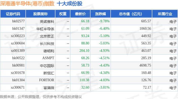 深港通半导体(港币)(983068)指数十大成份股详情如下: