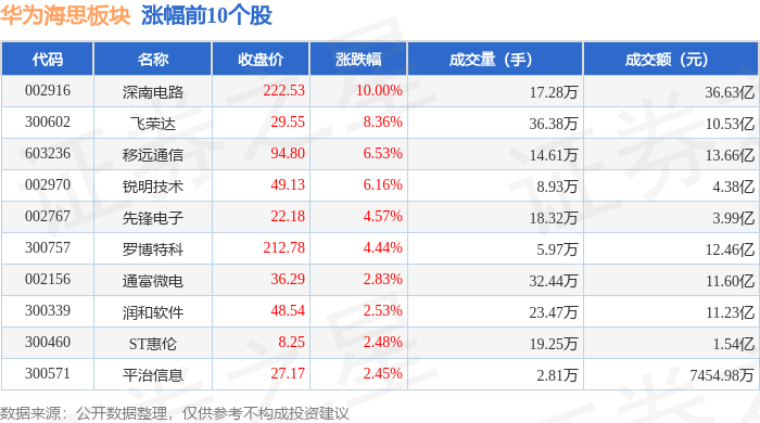 证券之星消息,12月17日华为海思板块较上一交易日上涨1.58%,深南电路领涨。当日上证指数报收于3870.28,上涨1.19%。深证成指报收于13224.51,上涨2.4%。华为海思板块个股涨跌见下表: