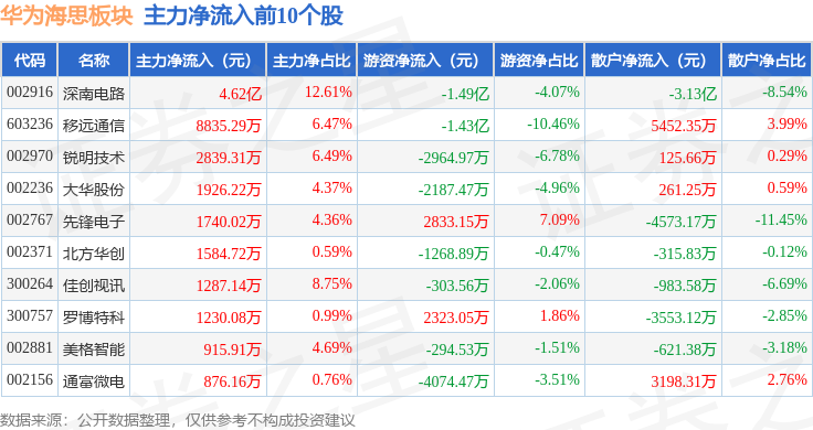 从资金流向上来看,当日华为海思板块主力资金净流出10.91亿元,游资资金净流出2.36亿元,散户资金净流入13.27亿元。华为海思板块个股资金流向见下表: