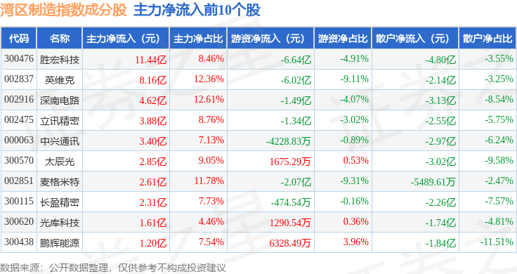 资金流向方面,湾区制造(980009)指数成份股当日主力资金净流入合计36.01亿元,游资资金净流出合计23.32亿元,散户资金净流出合计12.7亿元。成份股资金流向详情见下表: