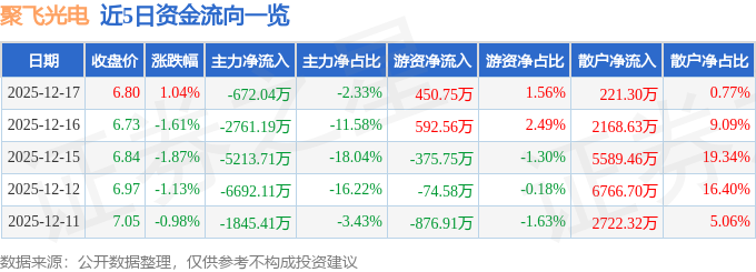 证券之星消息,截至2025年12月17日收盘,聚飞光电(300303)报收于6.8元,上涨1.04%,换手率3.24%,成交量42.99万手,成交额2.88亿元。