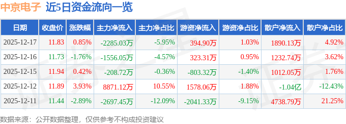 证券之星消息,截至2025年12月17日收盘,中京电子(002579)报收于11.83元,上涨0.85%,换手率5.66%,成交量33.04万手,成交额3.84亿元。