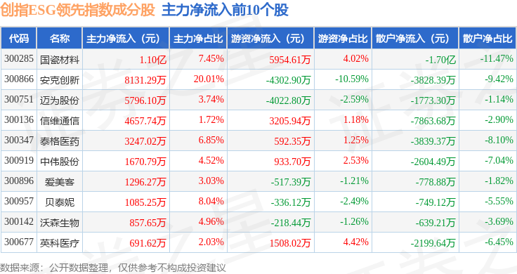资金流向方面,创指ESG领先(970031)指数成份股当日主力资金净流出合计51.97亿元,游资资金净流入合计19.28亿元,散户资金净流入合计32.69亿元。成份股资金流向详情见下表: