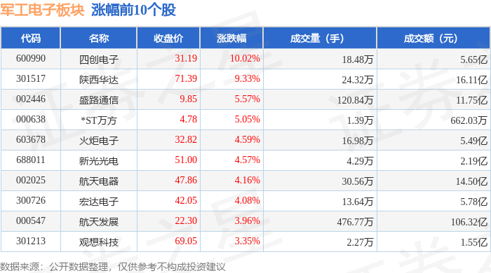 从资金流向上来看,当日军工电子板块主力资金净流入2.32亿元,游资资金净流出5.39亿元,散户资金净流入3.07亿元。军工电子板块个股资金流向见下表: