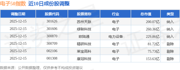 近10日内电子50(399281)指数成份股做了调整,新纳入了3只股票,剔除了3只股票。