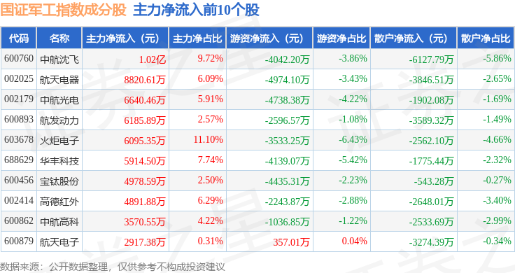 资金流向方面,国证军工(399368)指数成份股当日主力资金净流出合计8.91亿元,游资资金净流出合计3.33亿元,散户资金净流入合计12.24亿元。成份股资金流向详情见下表:
