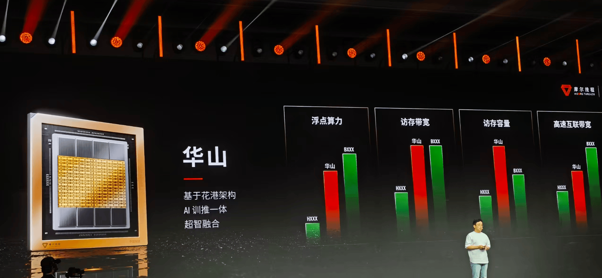现场对比显示,华山芯片在算力、存储和通讯等核心能力超过英伟达Hopper架构芯片,存储性能甚至赶上英伟达Blackwell 芯片。张建中在演讲中表示,该款产品性能基本达到国际一流产品水平。