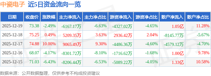 证券之星消息,截至2025年12月19日收盘,中瓷电子(003031)报收于73.38元,下跌2.49%,换手率3.71%,成交量12.63万手,成交额9.3亿元。