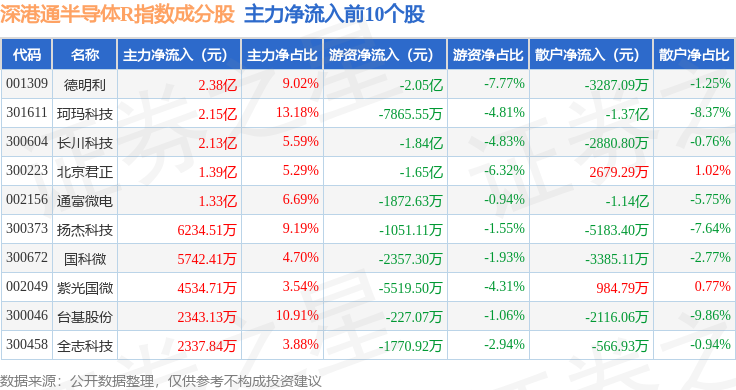 资金流向方面,深港通半导体R(483067)指数成份股当日主力资金净流入合计9802.0万元,游资资金净流出合计6.78亿元,散户资金净流入合计5.8亿元。成份股资金流向详情见下表: