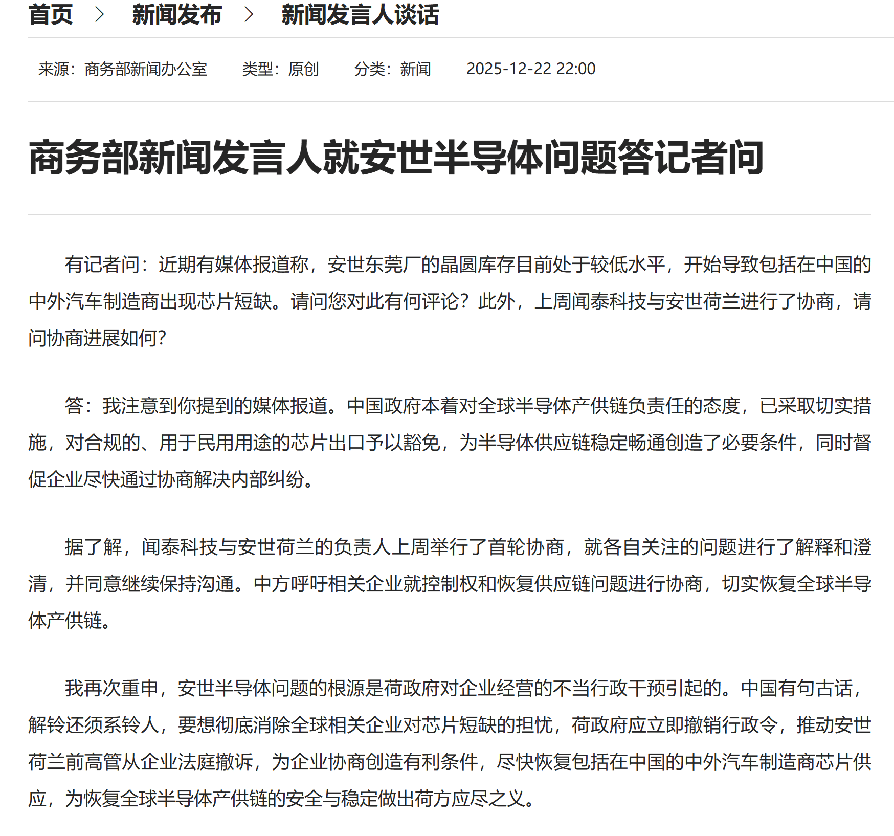 12月22日晚间,商务部新闻发言人就安世半导体问题答记者问。