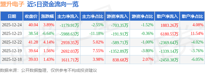 证券之星消息,截至2025年12月24日收盘,盟升电子(688311)报收于40.04元,上涨3.89%,换手率7.02%,成交量11.79万手,成交额4.62亿元。