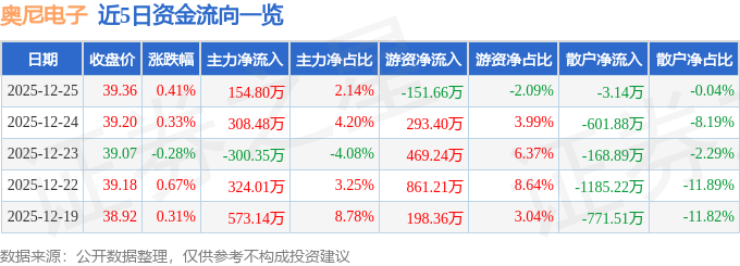 证券之星消息,截至2025年12月25日收盘,奥尼电子(301189)报收于39.36元,上涨0.41%,换手率1.64%,成交量1.84万手,成交额7239.94万元。