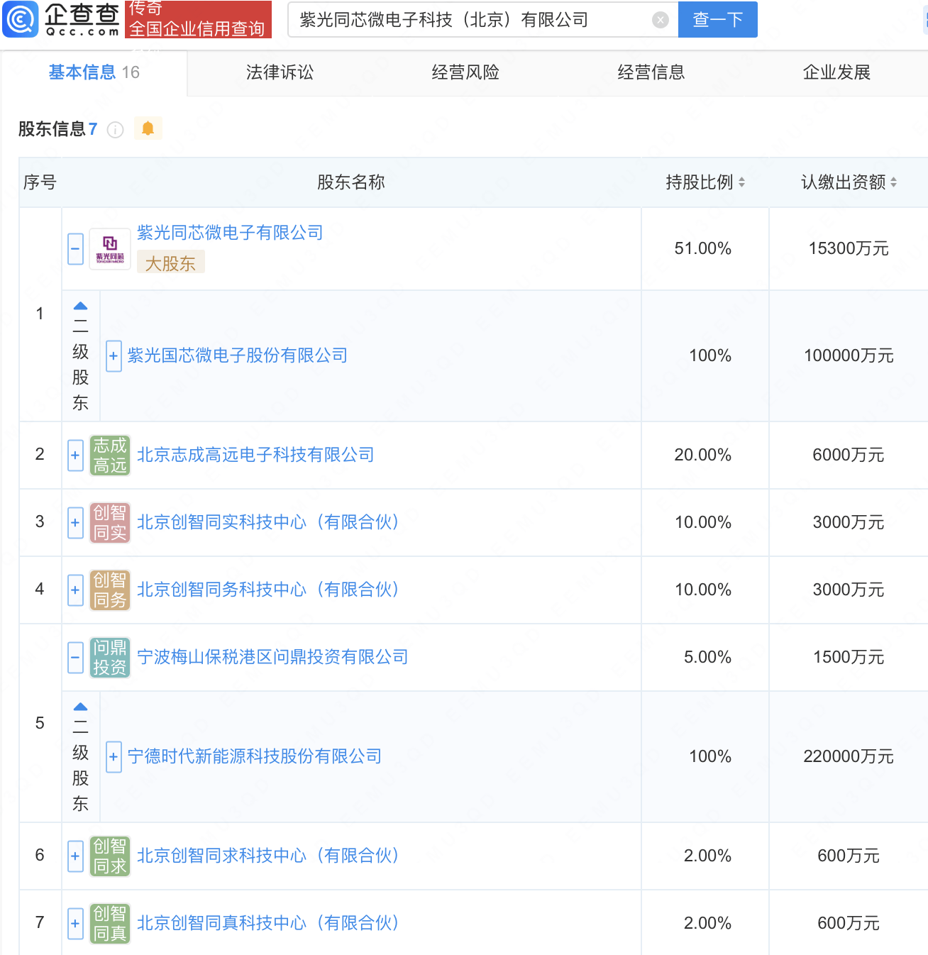 企查查APP显示,近日,紫光同芯微电子科技(北京)有限公司成立,注册资本3亿元,经营范围包含:集成电路设计;集成电路芯片设计及服务;电子产品销售等。企查查股权穿透显示,该公司由紫光国微(002049)全资子公司紫光同芯微电子有限公司、宁德时代(300750)全资子公司宁波梅山保税港区问鼎投资有限公司等共同持股。