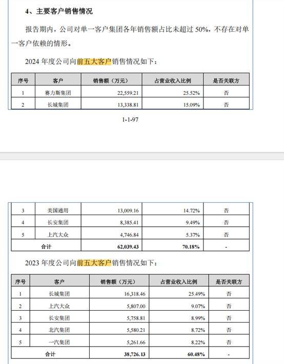根据披露,赛力斯集团和美国通用在2023年均未进入公司前五大客户名单,而在2024年分别跃居第一和第三大客户,销售收入分别为2.26亿元和1.30亿元,占营业收入比例分别为25.52%和14.72%。
