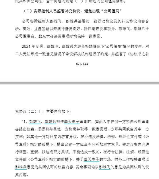 为应对此问题,2021年8月,彭雄飞、彭雄兵再次签署补充协议,明确在董事会提案和股东大会提案等重大事项方面,若意见不一,关于奉天电子的市场、财务工作相关事项以彭雄兵意见为准,其余事项均以彭雄飞的意见为准。