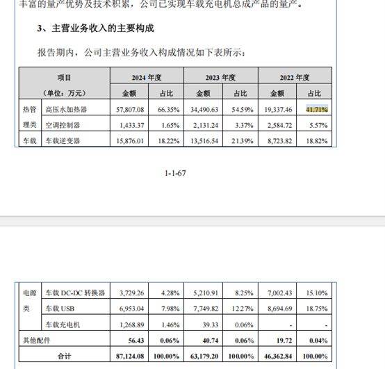 从现有产能来看,2024年,奉天电子高压水加热器产能为115万套,产能利用率为88%,也就是说,在原有产能并未饱和情况下公司打算大幅扩产约七成;此外,车载充电机系公司近年来重点布局的产品,虽公司招股书中披露取得赛力斯集团、东风集团等项目定点,但当前该产品并未放量,2024年销售收入仅为1268.89万元。