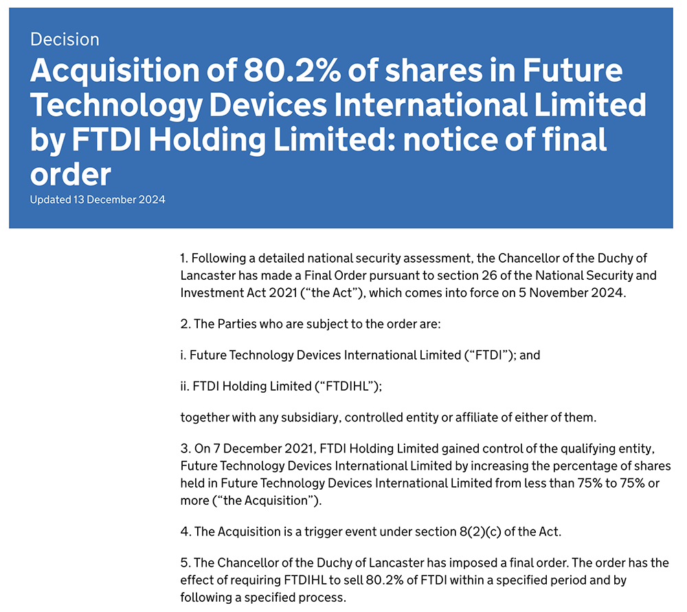 然而在交易完成近三年后,2024年11月5日,英国政府突然依据《2021年国家安全与投资法》(NISA)中的“回溯审查”条款,对这项收购发起追溯审查,并发布最终命令通知,要求FTDI Holding Ltd在限定时间内出售其持有的FTDI全部80.2%的股权,理由是存在国家安全风险。