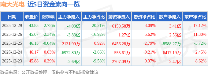 证券之星消息,截至2025年12月29日收盘,南大光电(300346)报收于43.83元,下跌2.75%,换手率6.89%,成交量45.22万手,成交额19.93亿元。