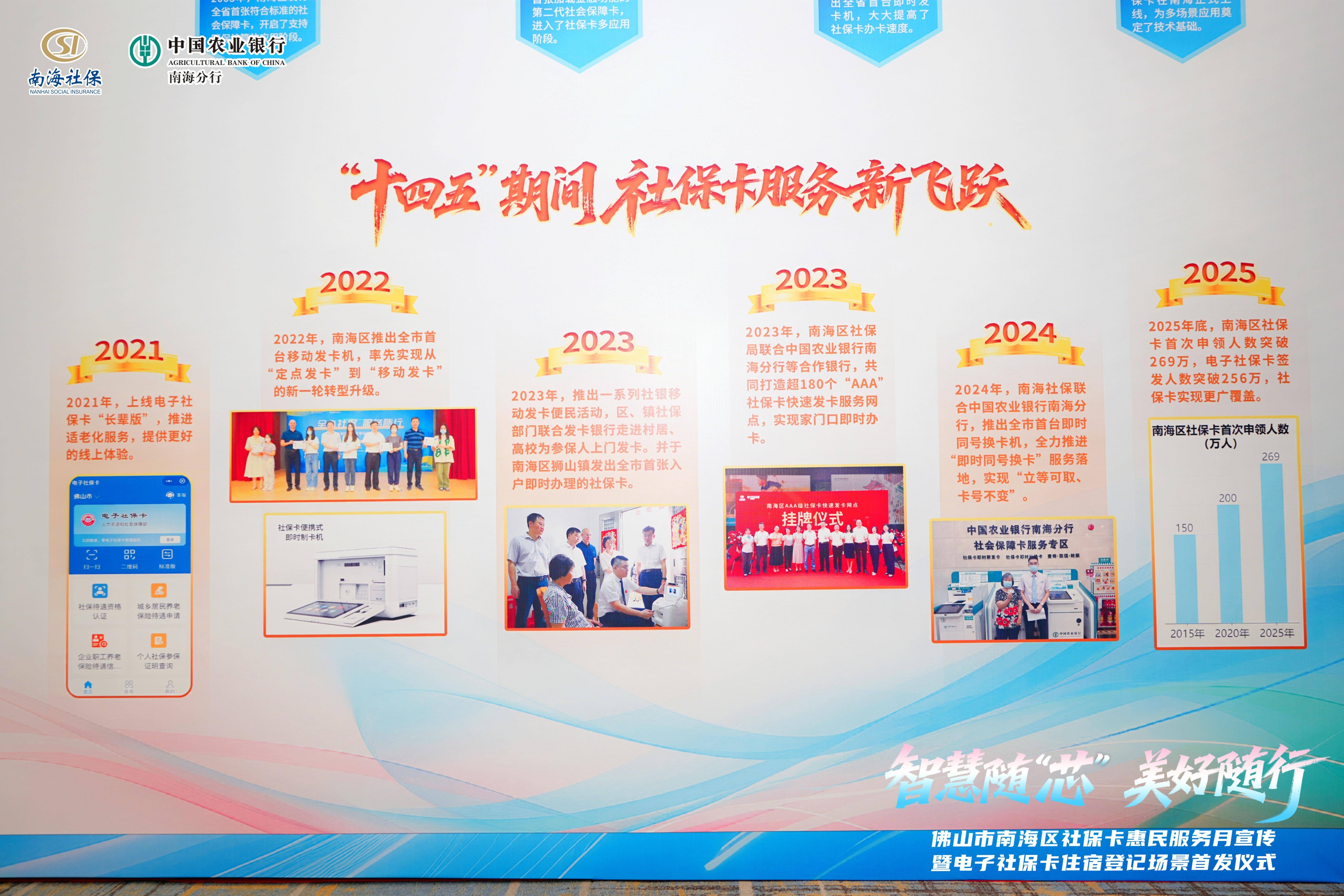 截至2025年底,南海区社保卡首次申领人数已超269万,电子社保卡签发人数突破256万,全区有网点的合作发卡银行15家,投放移动即时发卡设备252台,设立社保卡服务银行网点516个、快速制卡网点204个,构建起覆盖城乡、便捷高效的社保服务体系。