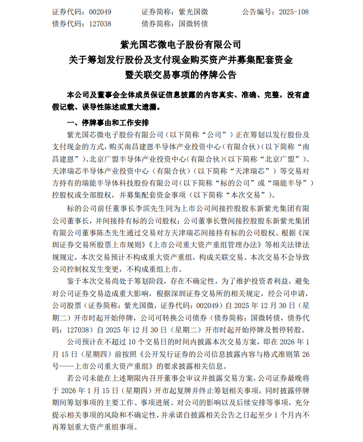 12月29日,紫光国芯微电子股份有限公司(简称“紫光国微”)发布公告,宣布正筹划以发行股份及支付现金的方式,收购南昌建恩半导体产业投资中心(有限合伙)、北京广盟半导体产业投资中心(有限合伙)、天津瑞芯半导体产业投资中心(有限合伙)等交易对方持有的瑞能半导体体科技股份有限公司(简称“瑞能半导体”)控股权或全部股权,并同步募集配套资金。受此事项影响,紫光国微股票及可转债“国微转债”自12月30日开市起停牌,可转债同时暂停转股。