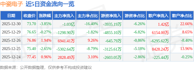 证券之星消息,截至2025年12月30日收盘,中瓷电子(003031)报收于73.7元,下跌3.85%,换手率2.49%,成交量8.46万手,成交额6.29亿元。