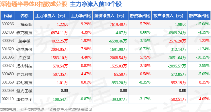 资金流向方面,深港通半导体R(483067)指数成份股当日主力资金净流出合计24.7亿元,游资资金净流入合计6.9亿元,散户资金净流入合计17.79亿元。成份股资金流向详情见下表:
