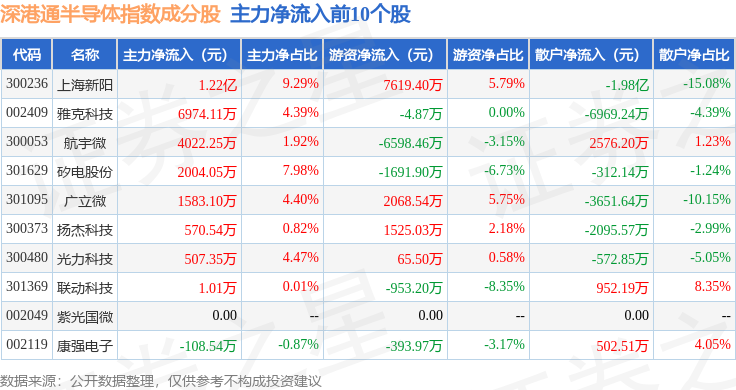 资金流向方面,深港通半导体(983067)指数成份股当日主力资金净流出合计24.7亿元,游资资金净流入合计6.9亿元,散户资金净流入合计17.79亿元。成份股资金流向详情见下表:
