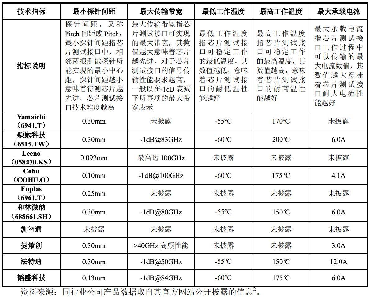 韬盛科技芯片测试接口多项技术指标均领先于或持平于海外龙头厂商,整体技术水平处于全球行业第一梯队。技术实力和衡量核心竞争力的关键业务数据、指标的比较情况: