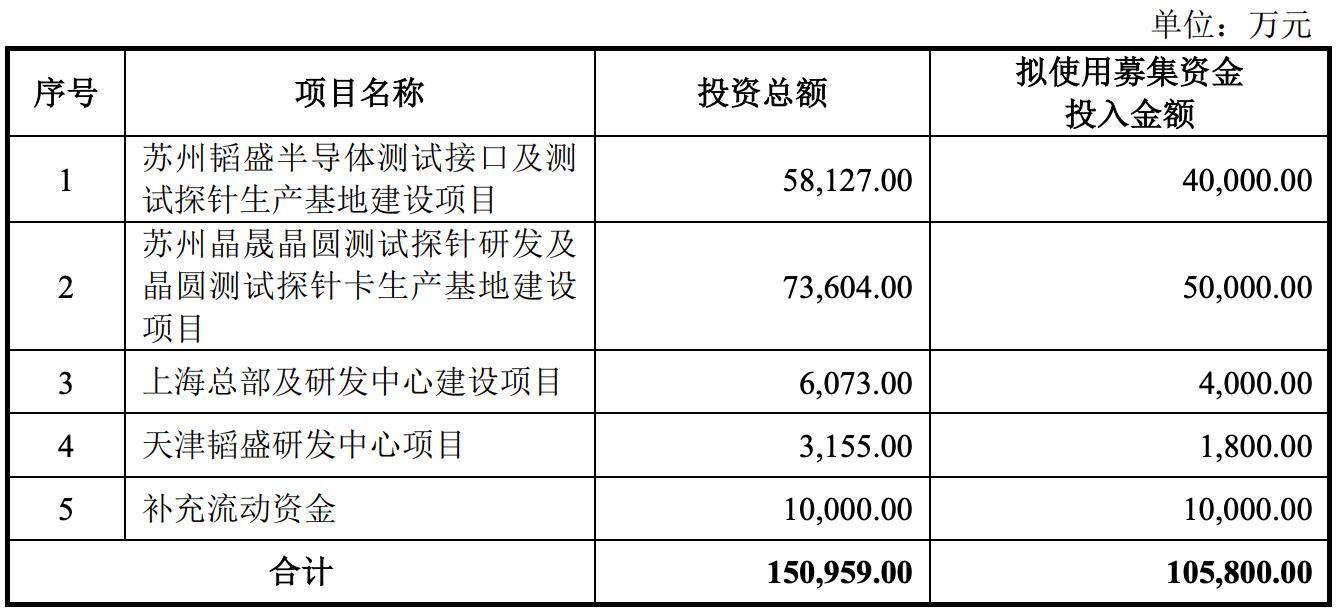 韬盛科技本次募集资金10.58亿元,将投资于苏州韬盛半导体测试接口及测试探针生产基地建设项目、苏州晶晟晶圆测试探针研发及晶圆测试探针卡生产基地建设项目、上海总部及研发中心建设项目、天津韬盛研发中心项目以及补充流动资金。